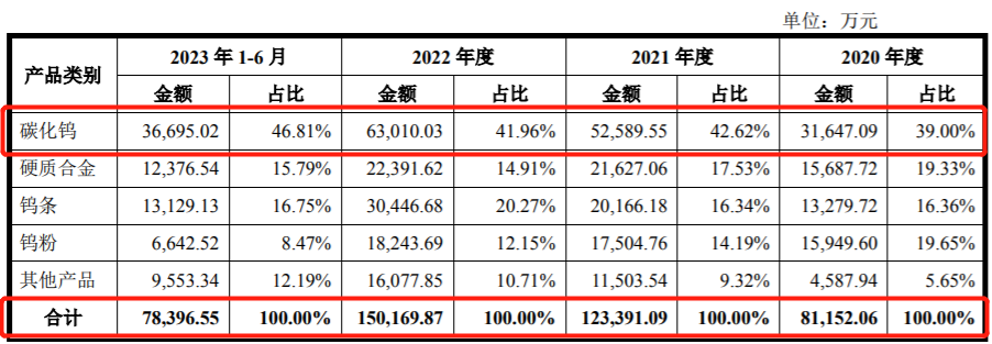 碳化钨是海盛钨业的核心产品。报告期内,公司碳化钨收入分别为3.16亿元、5.26亿元、6.30亿元和3.67亿元,占公司主营业务收入的比例分别为39%、42.62%、41.96%和46.81%。