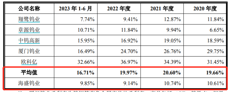 与此同时,同行业可比公司的毛利率均值分别为19.66%、20.60%、19.97%和16.71%,海盛钨业毛利率分别低于同行均值9.05个百分点、9.86个百分点、10.83个百分点和6.86个百分点。