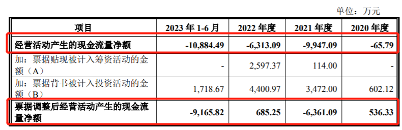 不仅如此,报告期内,海盛钨业经票据调整后的生产经营活动产生的现金流量净额分别为536.33万元、-6361.09万元、685.25万元和-9165.82万元。虽然经过调整,但2021年和2023年上半年现金流仍然处在净流出的状态。