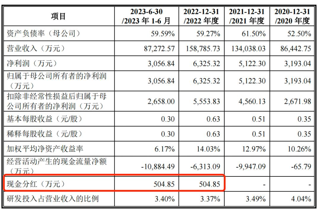 按理来说,向股东借款说明公司资金已经十分紧张,但奇怪的是,海盛钨业在2022年现金分红504.85万元,2023年上半年又再次分红504.85万元,其中的合理性令人怀疑。