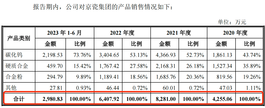 报告期内,海盛钨业向京瓷集团销售碳化钨、硬质合金、合金粉,销售收入分别为4255.06亿元、8281万元、6407.92万元和2980.83万元,占营业收入比例分别为4.92%、6.18%、4.04%和3.42%。