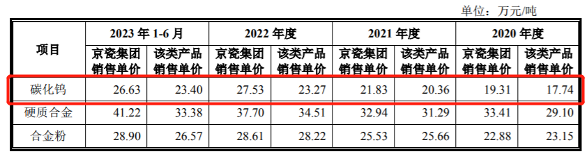 以核心产品碳化钨为例,报告期内,海盛钨业该类产品销售单价分别为17.74万元/吨、20.36万元/吨、23.27万元/吨和23.40万元/吨;公司对京瓷集团销售单价分别为19.31万元/吨、21.83万元/吨、27.53万元/吨和26.63万元/吨。