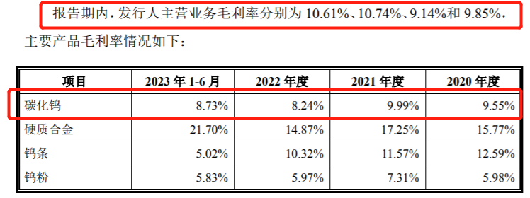 可见,海盛钨业碳化钨的营收逐年走高,但其毛利率却在走低,报告期内,其毛利率分别为9.55%、9.99%、8.24%和8.73%。