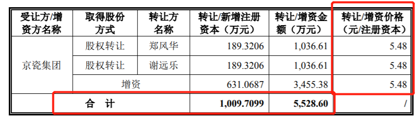 同年11月19日,郑风华和谢远乐分别将其持有的公司2%股权转让给京瓷集团,转让价格为1036.61万元,增资及股权转让价格均为5.48元/注册资本。