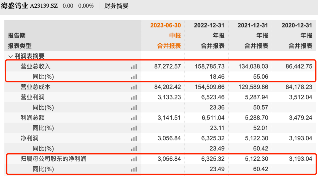 2020年-2023年上半年(以下简称“报告期”),海盛钨业的营业收入分别为8.64亿元、13.40亿元、15.88亿元和8.73亿元,同期归母净利润分别为3193.04万元、5122.30万元、6325.32万元和3056.84万元。