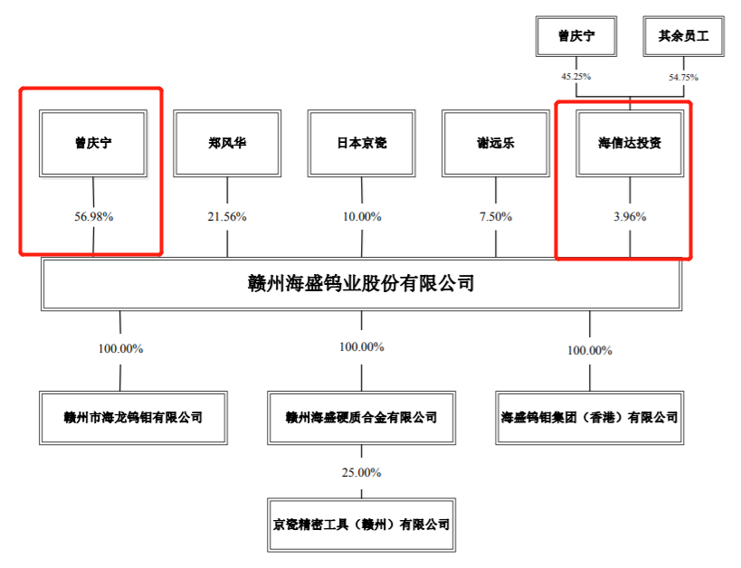 截至招股书签署日,海盛钨业的控股股东、实际控制人为曾庆宁,通过直接持股方式持有5752.92万股股份,并通过海信达投资间接控制400万股股份,合计支配公司60.94%股份的表决权,处于控股地位。
