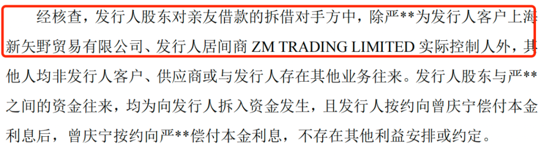 另外,「子弹财经」注意到,公司二轮审核问询回复函中显示,曾庆宁曾向亲友借款,其中就包括严**。