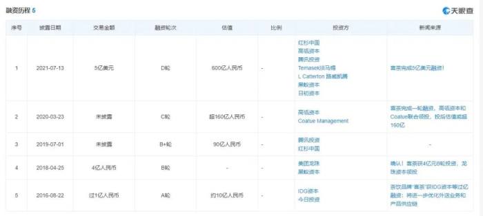 在发展历程中,喜茶进行了5轮融资,投资方包括高瓴资本、腾讯投资、美团龙珠、Temasek淡马锡等,合计融资数十亿元,2021年D轮融资后,估值高达600亿元。