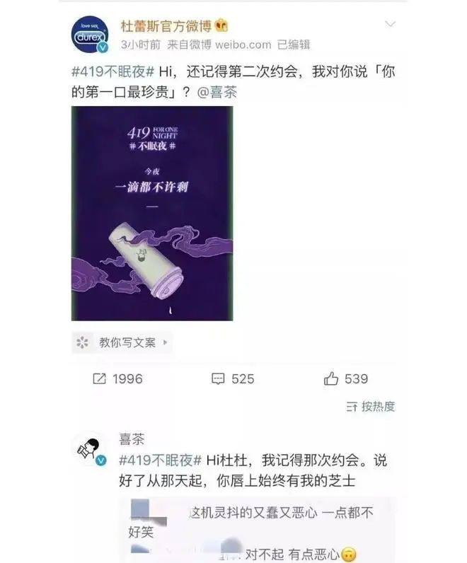 然而,联名多了,喜茶也出现不少翻车事件。据了解,在此次联名被约谈前,喜茶曾因联名杜蕾斯引发公众不满,网友纷纷表示“太恶心了”、“无法直视喜茶了”、“有心理阴影了”。随后喜茶公开致歉。