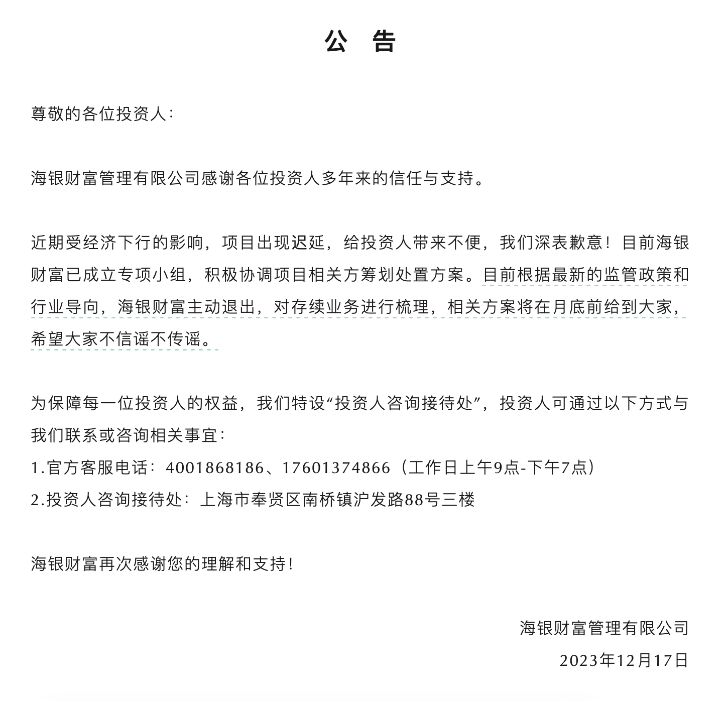 12月17日,海银财富官微发布公告称,近期受经济下行的影响,项目出现迟延,给投资人带来不便,我们深表歉意。目前海银财富已成立专项小组,积极协调项目相关方筹划处置方案。目前根据最新的监管政策和行业导向,海银财富主动退出,对存续业务进行梳理,相关方案将在月底前给出。