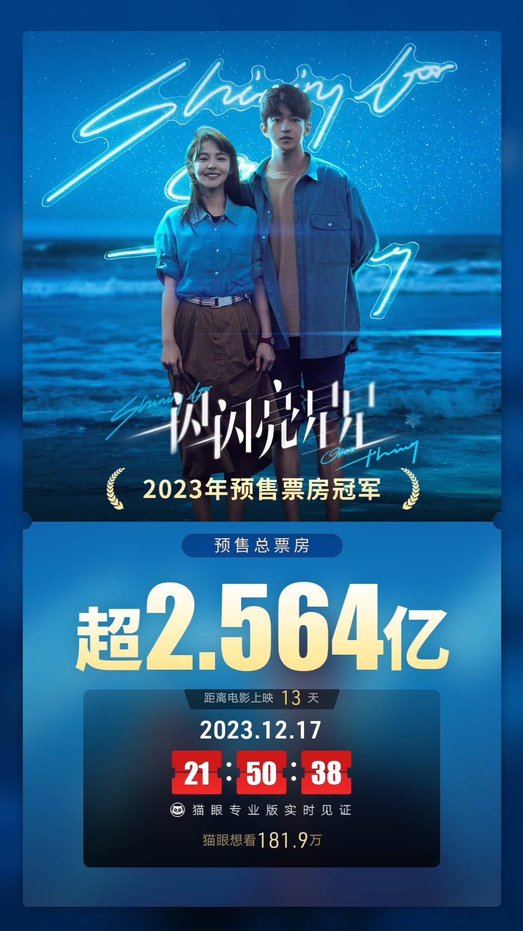 据猫眼专业版数据,电影《一闪一闪亮星星》预售总票房超2.564亿,登顶2023年预售票房榜。