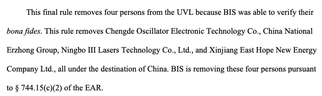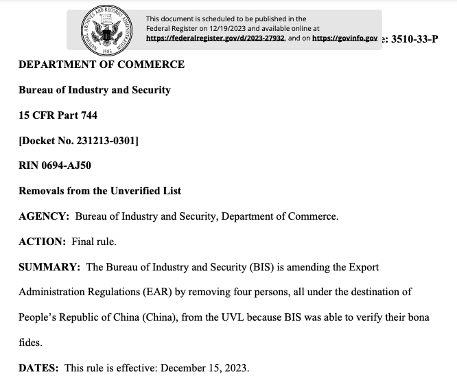 据美国政府在《联邦公报》(Federal Register)上发布的信息,一份由美国商务部工业与安全局(Bureau of Industry and Security)拟于12月19日发布的文件显示,工业与安全局修订美国《出口管理条例》(EAR),将4家中国公司移出“未经验证清单”(UVL),包括承德奥斯力特电子科技有限公司(Chengde Oscillator Electronic Technology Co.)、中国第二重型机械集团公司(China National Erzhong Group)、宁波大艾激光科技有限公司(Ningbo III Lasers Technology Co., Ltd.)以及新疆东方希望新能源有限公司(Xinjiang East Hope New Energy Company Ltd.),这一修订自12月15日起生效。