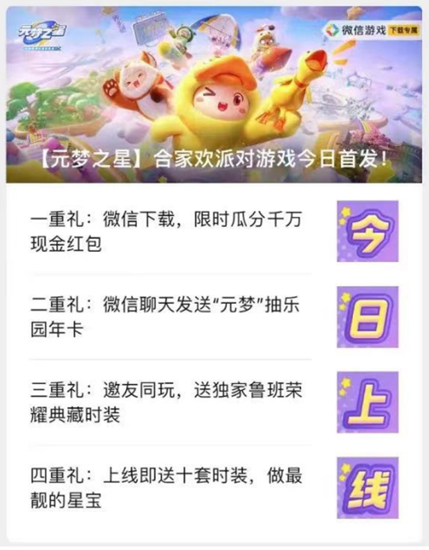 如此一来,玩家在QQ与微信上聊天时提到“元梦之星”能看到表情雨,可以在QQ与微信平台拿到大量的游戏福利,在《元梦之星》中玩到《王者荣耀》的地图,与《王者荣耀》账号绑定就能在《王者荣耀》中领取皮肤,在游戏中还可以点播腾讯平台的音乐与动画,甚至领取“美团骑手”皮肤。