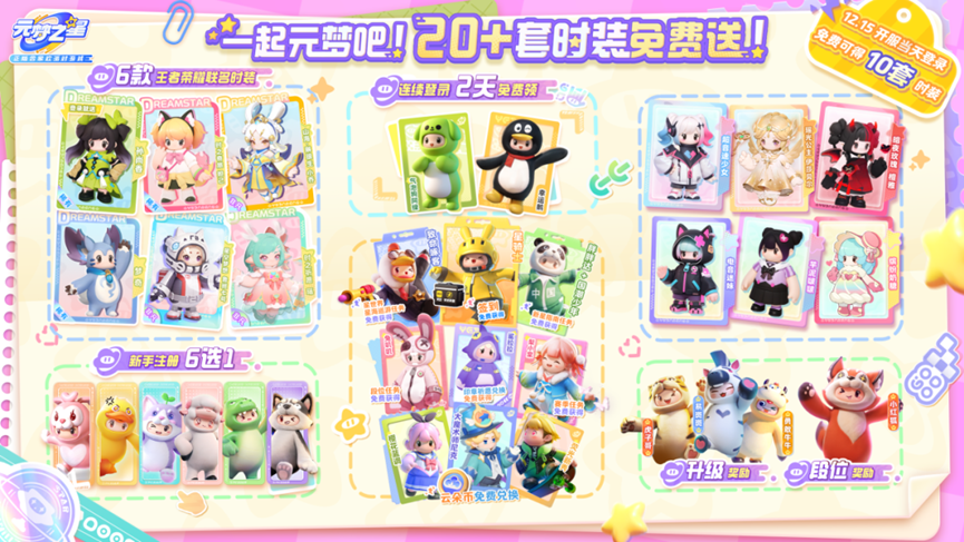 ▲图:《元梦之星》为玩家准备了20+要时装免费送,其中站在C位的就是美团骑手皮肤