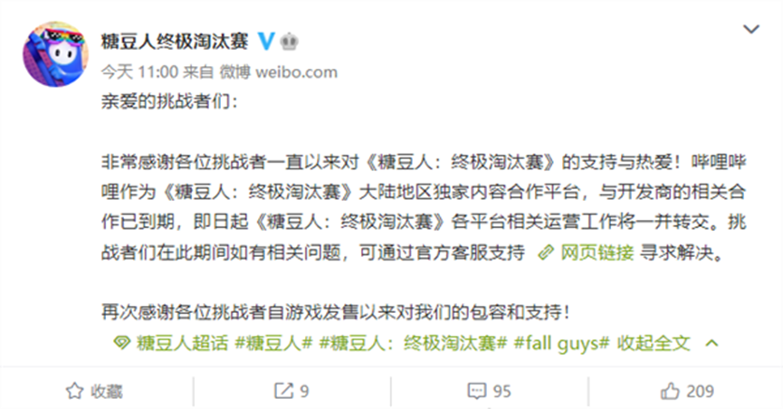 ▲图:《糖豆人:终极淘汰赛》官方发文称B站作为大陆地区独家内容合作平台,与开发商的相关合作已到期
