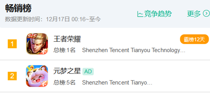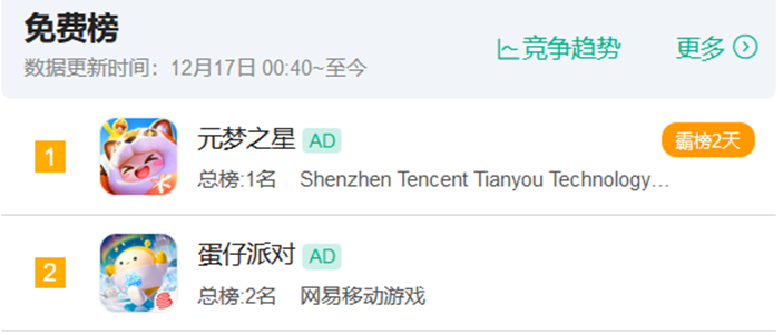当然腾讯也不是输家,《元梦之星》也取得了不错的成绩,比如免费榜霸占第一,在畅销榜上虽然没能超越自己的老大哥《王者荣耀》,最高第二的排名足以力压《蛋仔派对》一头,但这仍然不足以宣告腾讯大获全胜,而且新游在排行榜上是有Buff加成的,未必能足够客观地反映实情。