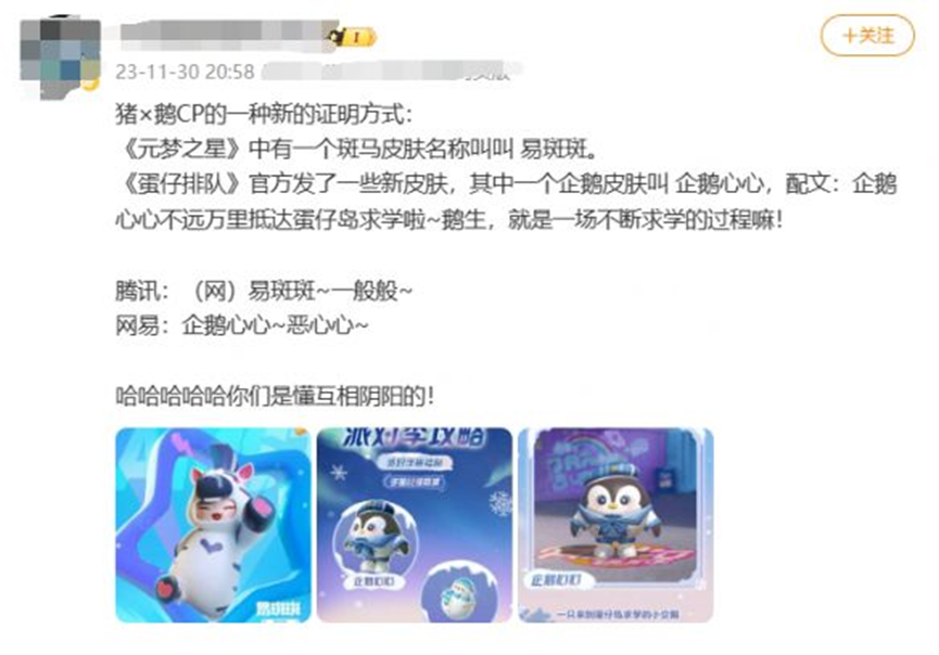 如今,腾讯推出《元梦之星》,其直接竞品就是网易的《蛋仔派对》。双方早在12月15日之前便已剑拔弩张,比如《元梦之星》早在暑假内测时就先给玩家上线一个“易斑斑”(一般般)的斑马条纹时装皮肤,反应有点迟钝的《蛋仔派对》直到11月才发现对方的小心思,于是在12月1日毫不示弱跟着上了一个“鹅心心”(恶心心)的企鹅外观皮肤。