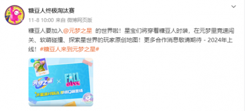 ▲图:《糖豆人:终极淘汰赛》官方发文表示与《元梦之星》达成正版授权合作