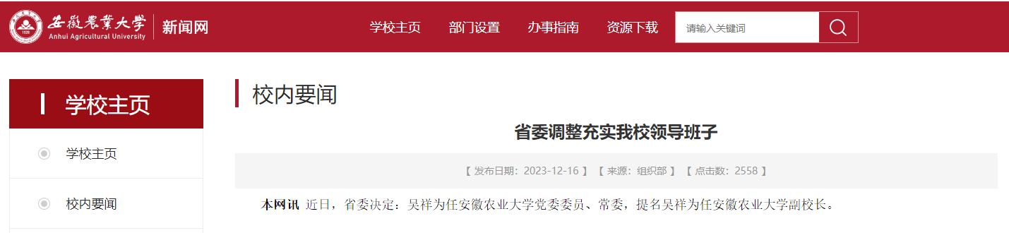 据安徽农业大学官网显示,近日,安徽省委决定:吴祥为任安徽农业大学党委委员、常委,提名吴祥为任安徽农业大学副校长。