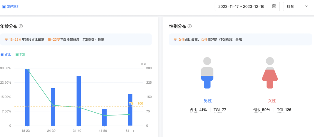 《蛋仔派对》抖音关联用户中,同样18-23岁用户占比较多,接近30%。二者用户画像差别不大,但《蛋仔》的女玩家占比更高。