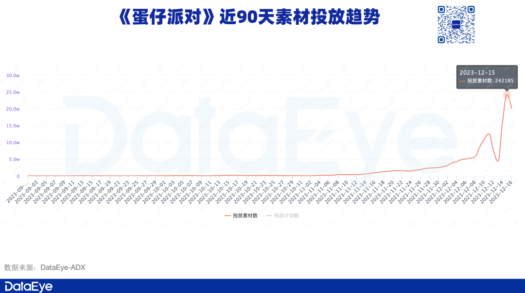 与之相比,《蛋仔派对》在最近三个月素材投放量开始飙升: