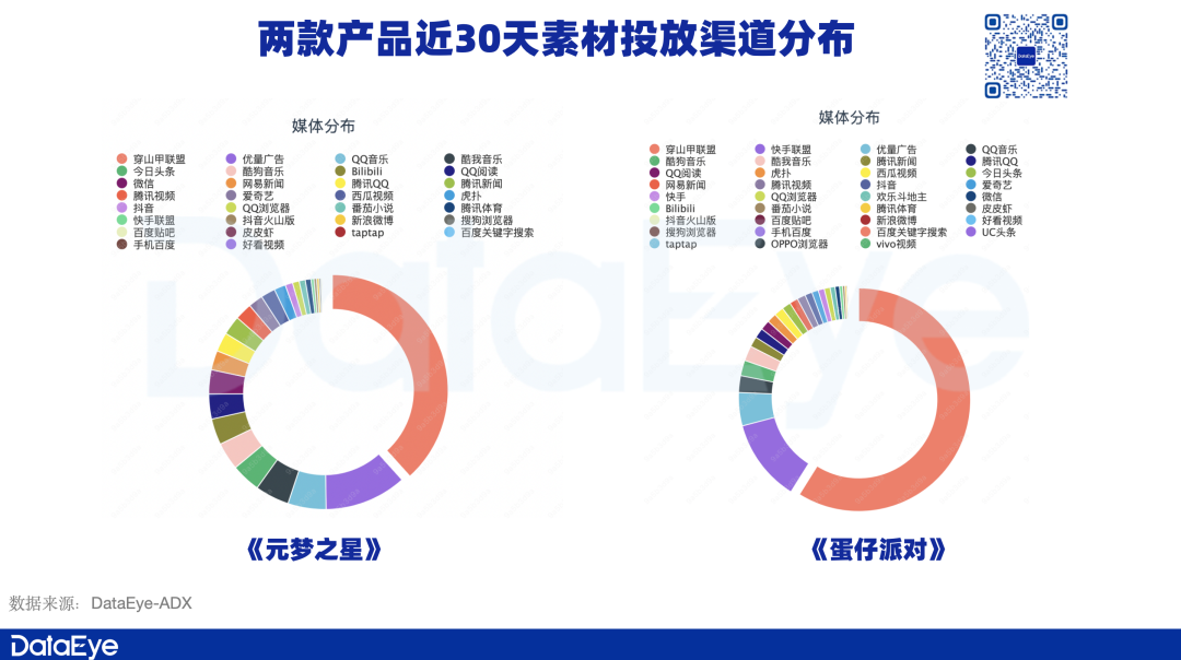 DataEye-ADX显示,近30天,《元梦之星》投放渠道中,穿山甲联盟占比较多,约为38%,其次则是优量广告接近12%的占比。而《蛋仔派对》主投穿山甲、快手、优量广告,其中穿山甲联盟占比达到近60%。