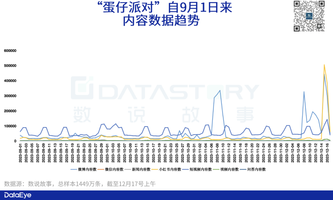 同期,《蛋仔派对》国内全网内容数约为1449万条,其中微博内容最多,其次是小红书。
