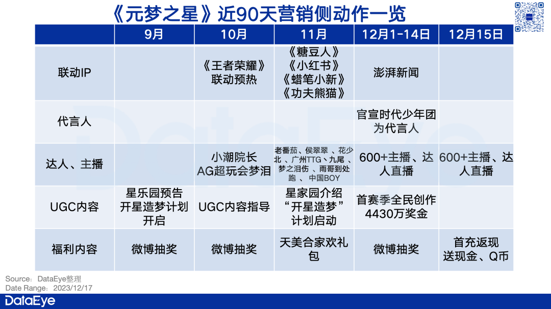 9月、10月是《元梦之星》的预热期,主要是在微博、公众号发布游戏相关内容。从11月起,便开始集中资源、爆发+饱和式营销推广,代言→联动→直播→UGC→游戏福利内容,有关品牌侧的领域,腾讯都倾斜了较多的资源。