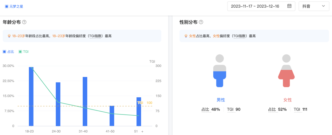 用户属性方面,巨量算数统计,近30天,《元梦之星》抖音关联用户中,18-23岁用户占比较多,接近30%。其次则是31-40岁的用户,占比约为25%。