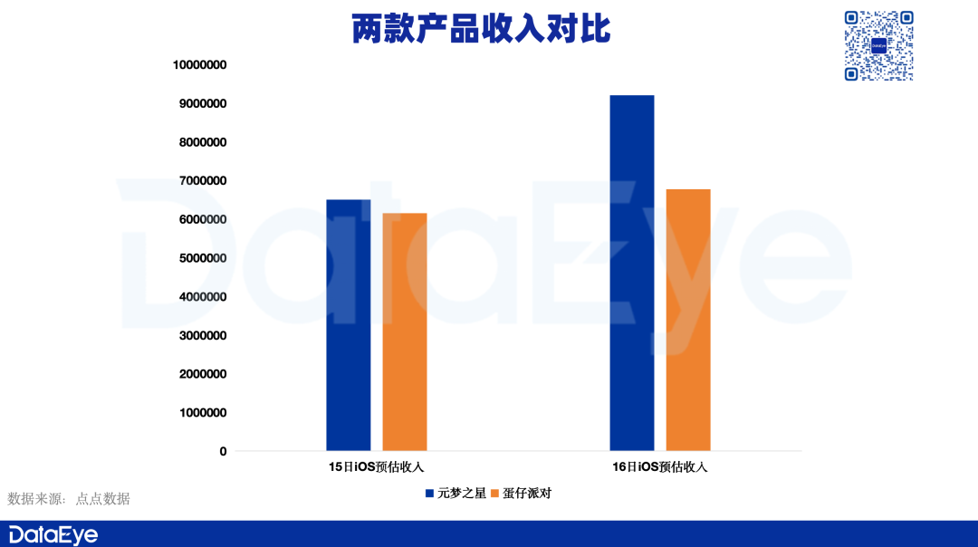 12月15日iOS端预估收入(已扣除平台分成),《元梦之星》15日约为650万元人民币、16日约为920万元;略胜于《蛋仔派对》同期的615万元、677万元。