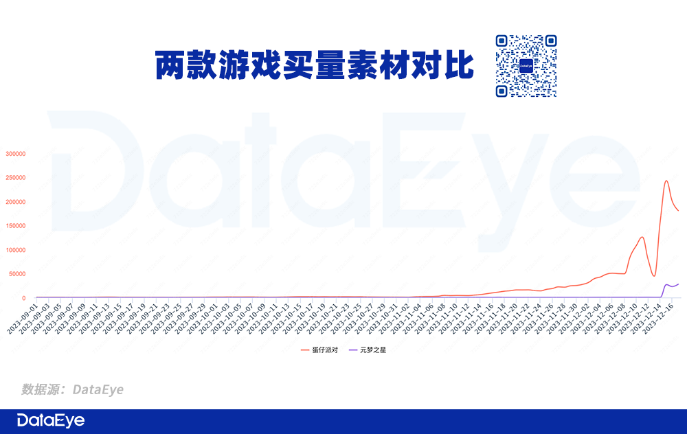 到了12月,从10号开始,《蛋仔》连续一周单日素材投放量超过达到了10万组,在《元梦》上线当天更是达到恐怖的单日24万组素材投放!