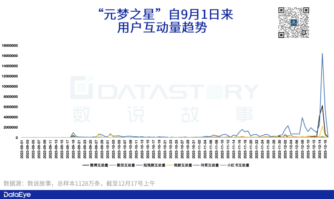 9月以来,《元梦之星》国内全网达到了9415万,短视频、微博是玩家的主要互动平台。互动高峰主要集中在9月19日(预约开启)、11月中旬(高粉丝抖音创作者内容)、12月上旬(与《王者荣耀》联动皮肤)以及上线当天。
