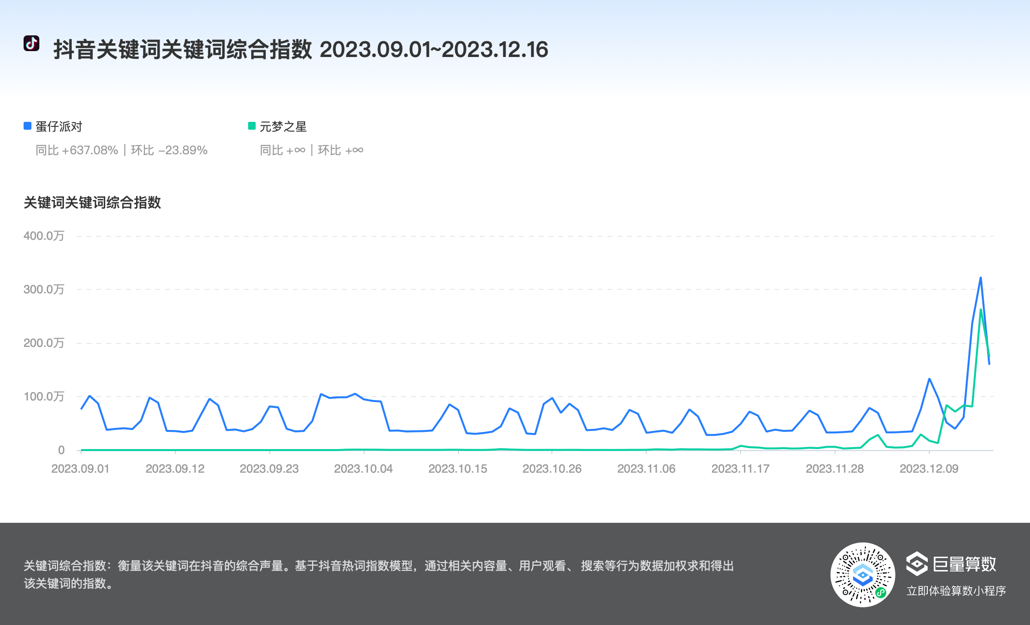 单看抖音,巨量算数的数据是:《蛋仔》综合指数一直力压《元梦》。后者公测当天,二者较为接近。