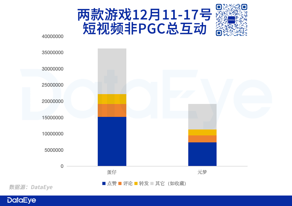 单看12月11——17号的一周(这样比较可比),二者短视频平台UGC内容(剔除了官方PGC内容,但没剔除官方合作达人情况)总互动量情况:《蛋仔》2221.57万,《元梦》1128.32万,约一倍差距,并非不可跨越。具体构成如下。