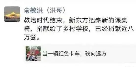 “教培时代结束,新东方把崭新的课桌椅,捐给了乡村学校,已经捐献近八万套。”俞敏洪发布的动态冲上热搜,文章提及,作为教培行业巨头,新东方上一次热搜,还是因为双减政策,教培行业受到巨大冲击,新东方股价蒸发90%,作为掌舵人的俞敏洪几乎一夜白头的消息。