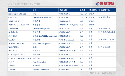 不仅是ADC,在细胞疗法领域,国内药企也处于领先身位。例如,在CAR-T疗法的红斑狼疮适应症的探索中,许多国内选手的研发进度跑到了海外大药企的前面。