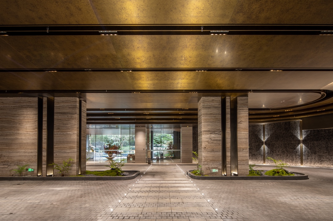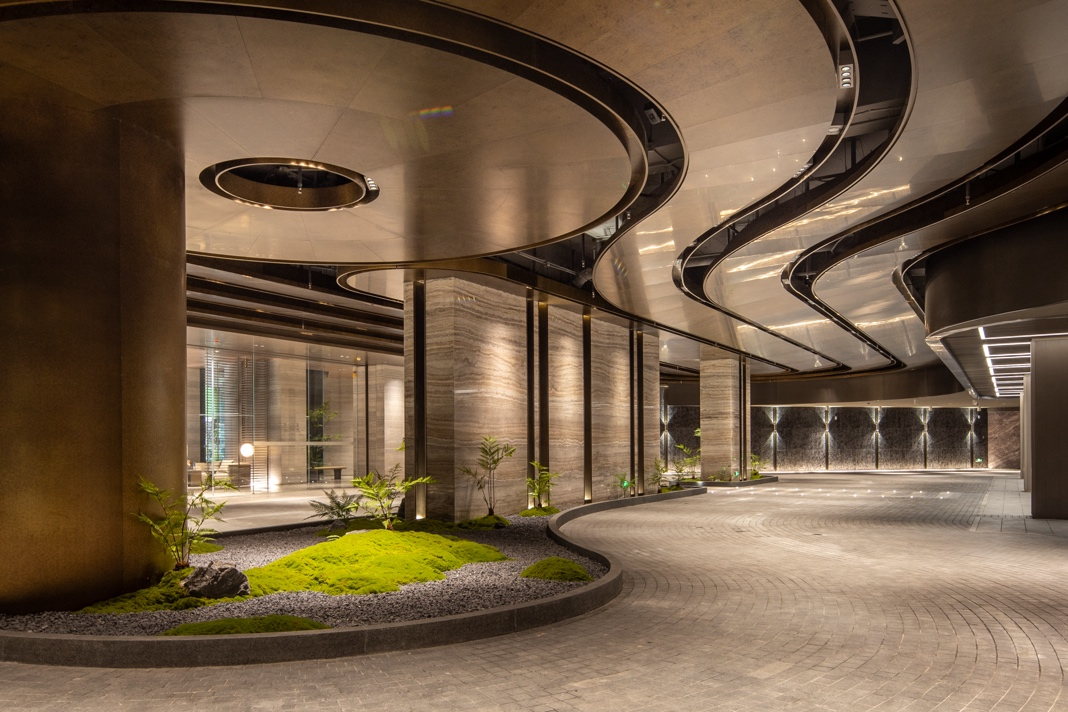 琶洲·樾“新派科技豪宅”的内核,在于满足业主个性化需求和深度渗透生活场景。项目落客区采用星级酒店环岛落客设计,利用洄游动线,不仅实现车辆高效出入,更彰显出落客归家的尊崇感。落客区顶部采用顺延地面车道弧线的金属带状灯槽,天花光线随着行驶路径闪耀,如灵动的飘带引领归家之路,无声诉说着豪宅的臻享仪式。