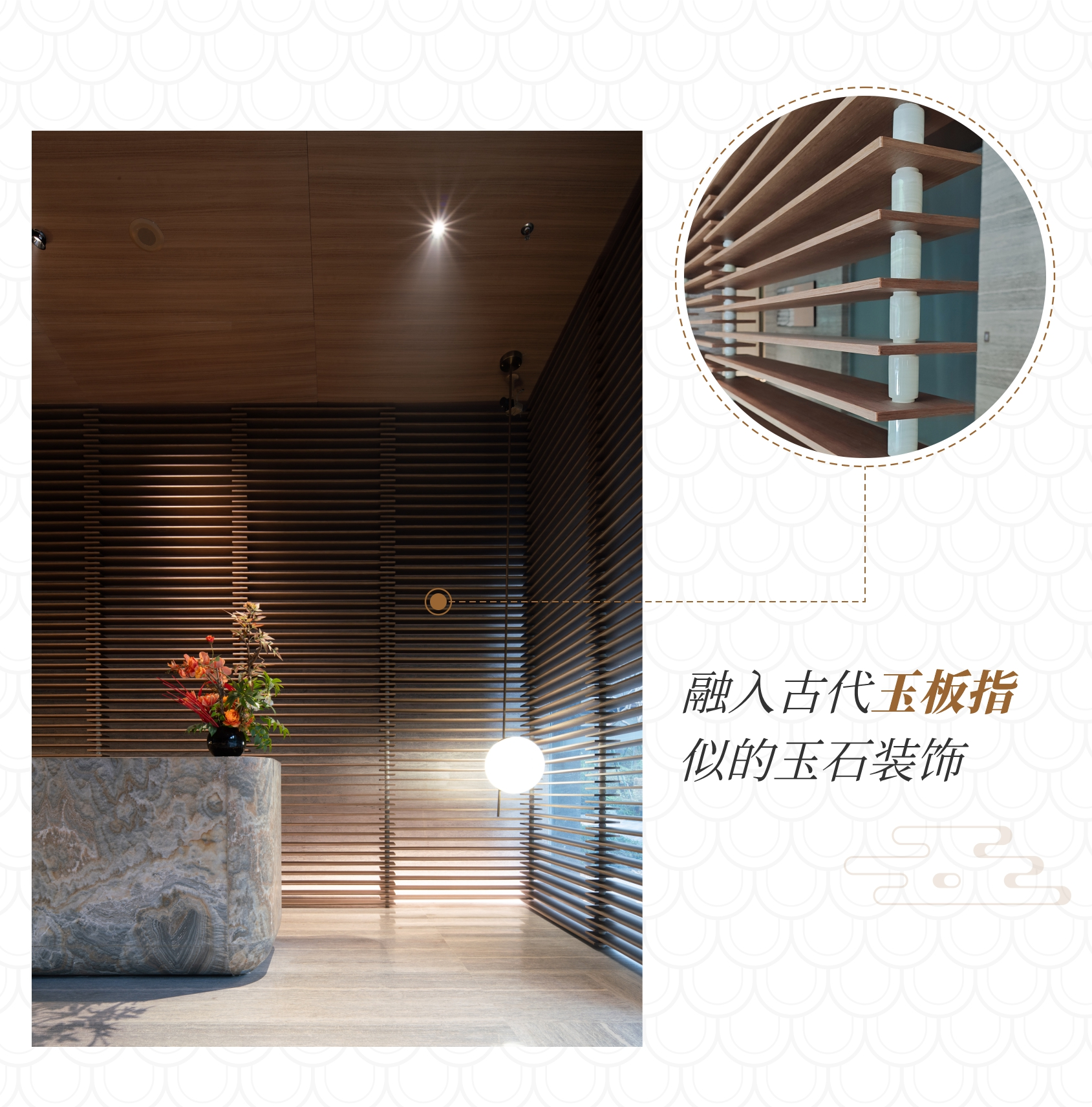 “玲珑”亦有玉器清越声音之意,设计师还巧取樾·玲珑的玉石元素,把每一个空间串连成珠。会所大堂屏风融入玉扳指造型玉石作为连接构建,让尊贵的身份感在空间延续。