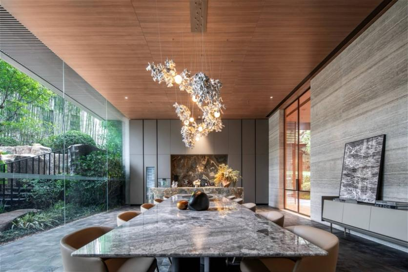 在琶洲·樾的园林设计上,以海港为灵感,呈现出别致的东方美学园林风景,勾勒出世界东方的先锋审美。园林采用了102块大理石以及多种名贵树种,光是打造承载庭院海港精神的“航海石”,便花费大量时间从数百张手稿,遴选最符合庭院呈现方式,再寻找时间肌理下形成的自然景石,邀请手艺醇熟的专业匠人,极尽天然地雕琢,还原出观海之庭的壮阔精神。