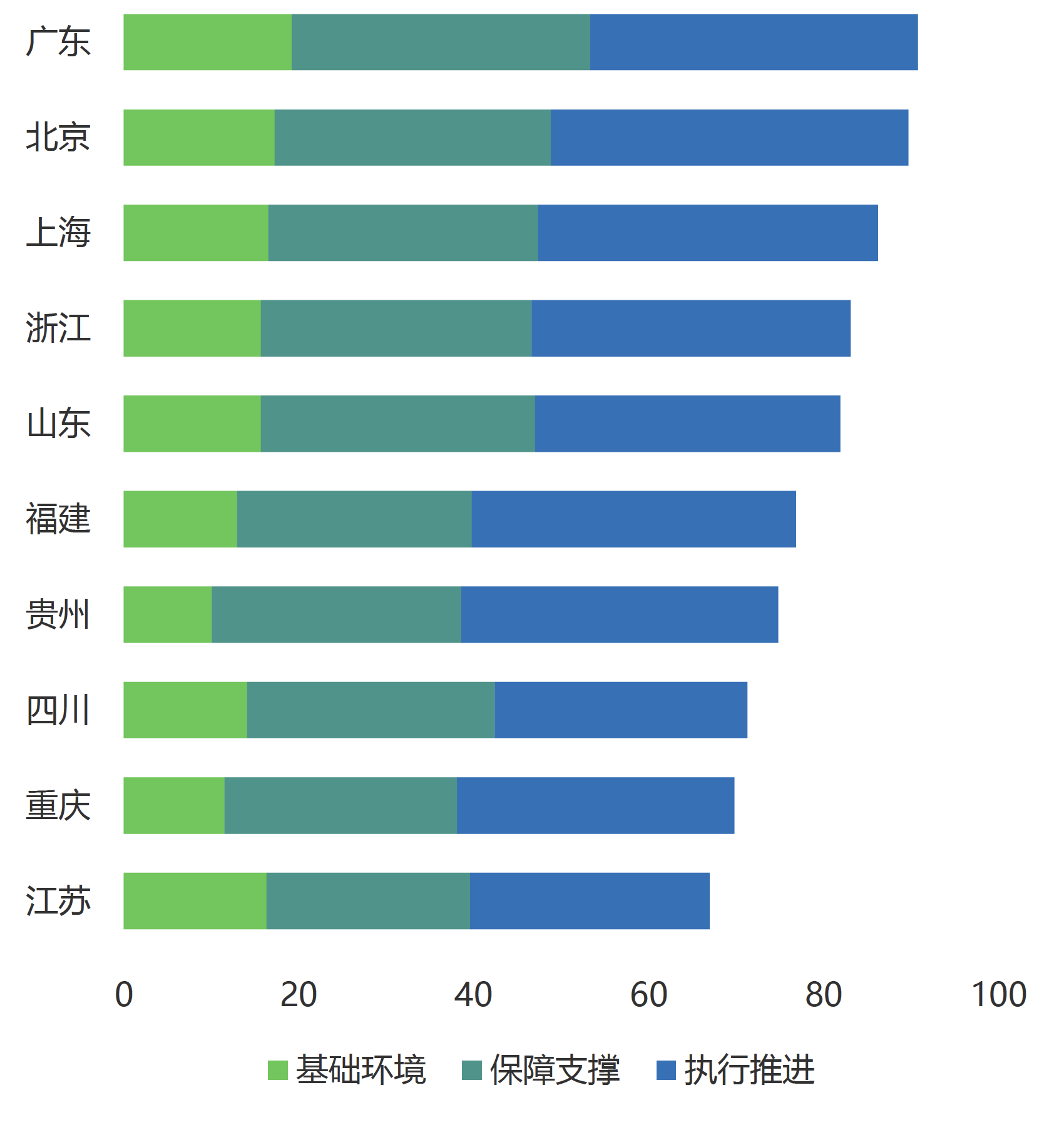 区域层面来看,东部地区以广东省、北京市、上海市为代表,整体推进力水平位居全国前列,在基础环境、保障支持和执行推进方面都展现出了较为全面的推进能力。同时,北京、上海、广州、深圳等核心城市形成辐射,带动了周边地区的协同发展,京津冀、粤港澳、长三角地区不断激发出自身的数字经济和数据要素市场发展活力。