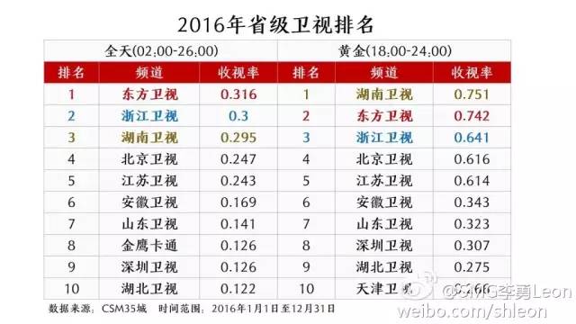 东方卫视的“网红总监”李勇数日前在微博发布了年度成绩单:“截止昨晚(12月28日),2016全年收视概况,数据依据:CSM索福瑞35城,4+。东方卫视,全天第一,黄金第二,白天第二,深夜第一。”