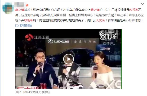 当他提到自己正在参加的江苏周日档综艺《我们的挑战》时,半认真半玩笑说:“口碑很好但是收视率不高,这是为什么呢?”搭档的江疏影和另一位男主持瞬间冷冻:“这是为什么呢?”薛之谦回答:“因为江苏卫视不买收视率啊!”两位主持愣了两秒钟好尴尬的笑了。网友们顿时炸开了锅:说什么大实话呢!