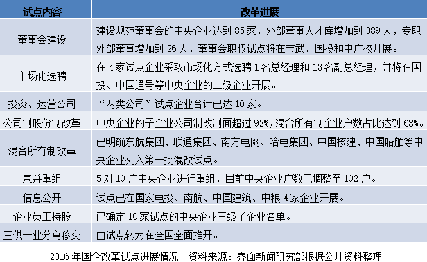 在完成顶层设计的同时,国企改革方向也逐渐明确。2016年2月底,国资委公布了国企“十项改革试点”内容,包括国有资本投资运营公司、央企兼并重组、部分重要领域混合所有制改革、混合所有制员工持股、落实董事会职权、市场化选聘经营管理者、企业薪酬分配制度差异化改革、推行职业经理人制度、国有企业信息公开、剥离企业办社会职能和解决历史遗留问题,细化和改进了国企改革的具体领域和方向。