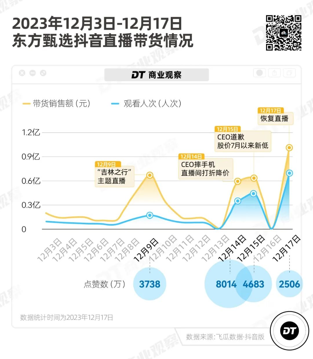 在昨天(12月17日)最新一场直播里,东方甄选的预估GMV达到1亿以上,观看人次接近7000万,是之前平均水平的七倍。