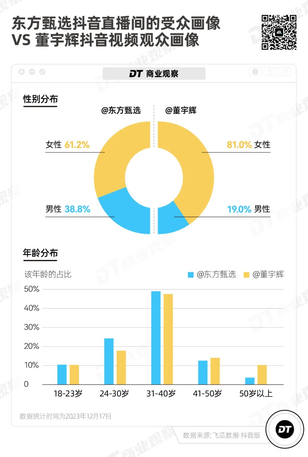 我们先来看东方甄选和董宇辉的粉丝:基本盘都是30岁以上的人群、女性偏多。