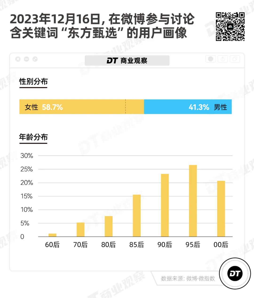 微指数显示,12月16日在微博参与含“东方甄选”关键词博文的用户画像中,00后、95后和90后占大头,基本上是30岁以下的年轻群体。