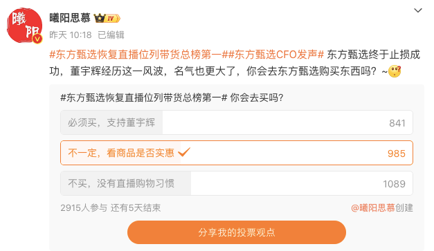 参考 @曦阳思慕 近期发布的一个微博投票,结论也是相似的:看商品是否实惠的比坚定支持董宇辉的人群占比稍高一些,更多的还是围观的吃瓜群众,有超过1/3的人没有直播购物习惯。