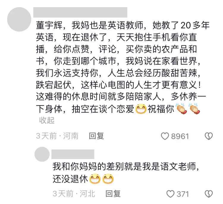 其中,有不少自称是“老太太”“叔叔”“和你妈同龄”等中老年粉丝,都在评论中亲切地叫董宇辉为“孩子”,表达自己对董宇辉的喜欢和支持。