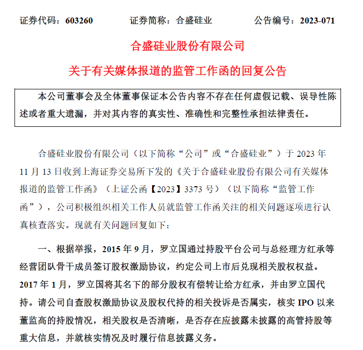 12月8日披露的公告显示,合盛硅业于2023年11月13日收到上海证券交易所下发的《关于合盛硅业股份有限公司有关媒体报道的监管工作函》。