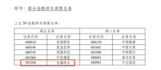 11月24日,上交所发布了关于上证50等指数定期调整结果的公告,于2023年12月8日收市后生效。公告显示,此次上证50指数调出5只样本,合盛硅业被剔出该指数。